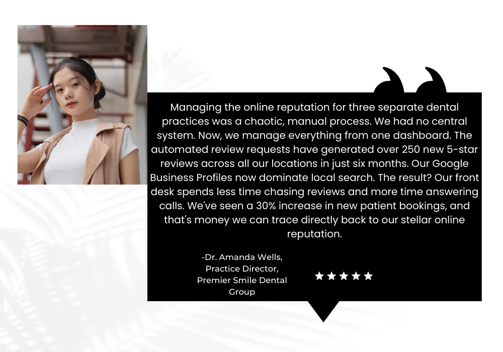 A dental group with four locations struggled with an inconsistent online reputation. Each office had a different star rating, and there was no centralized process for generating or responding to patient feedback.